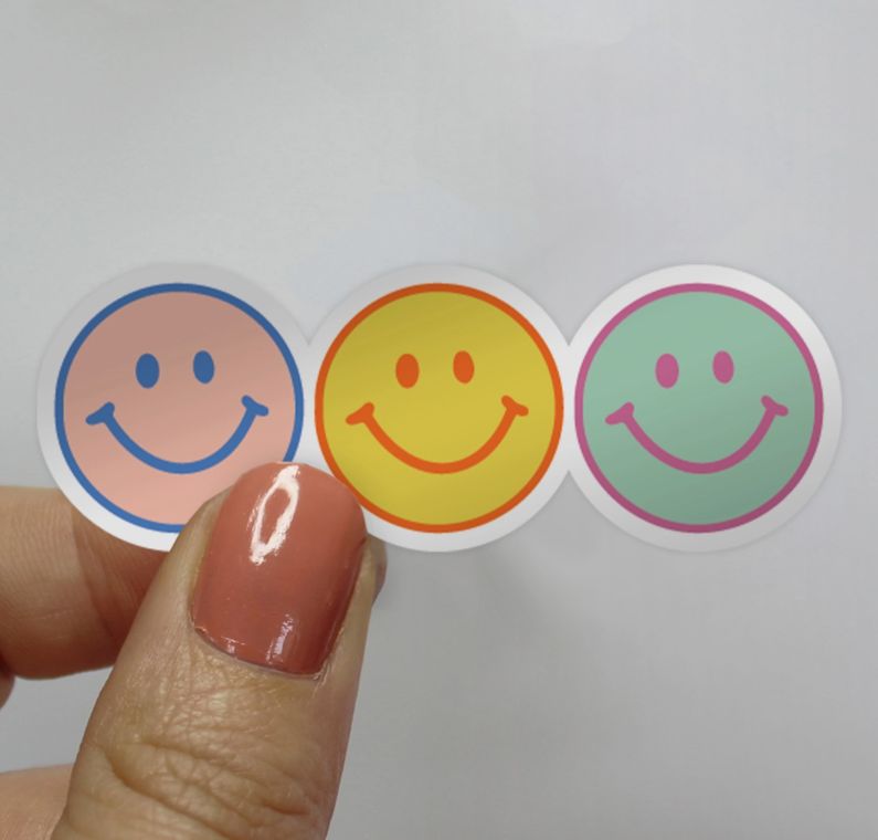 This fun sticker is perfect for your water bottle, laptop, notebook & more! The sticker features three smiley faces in various bright colors. This sticker is sized to 1.25 x 3.5 inches with a glossy, water-resistant coating.